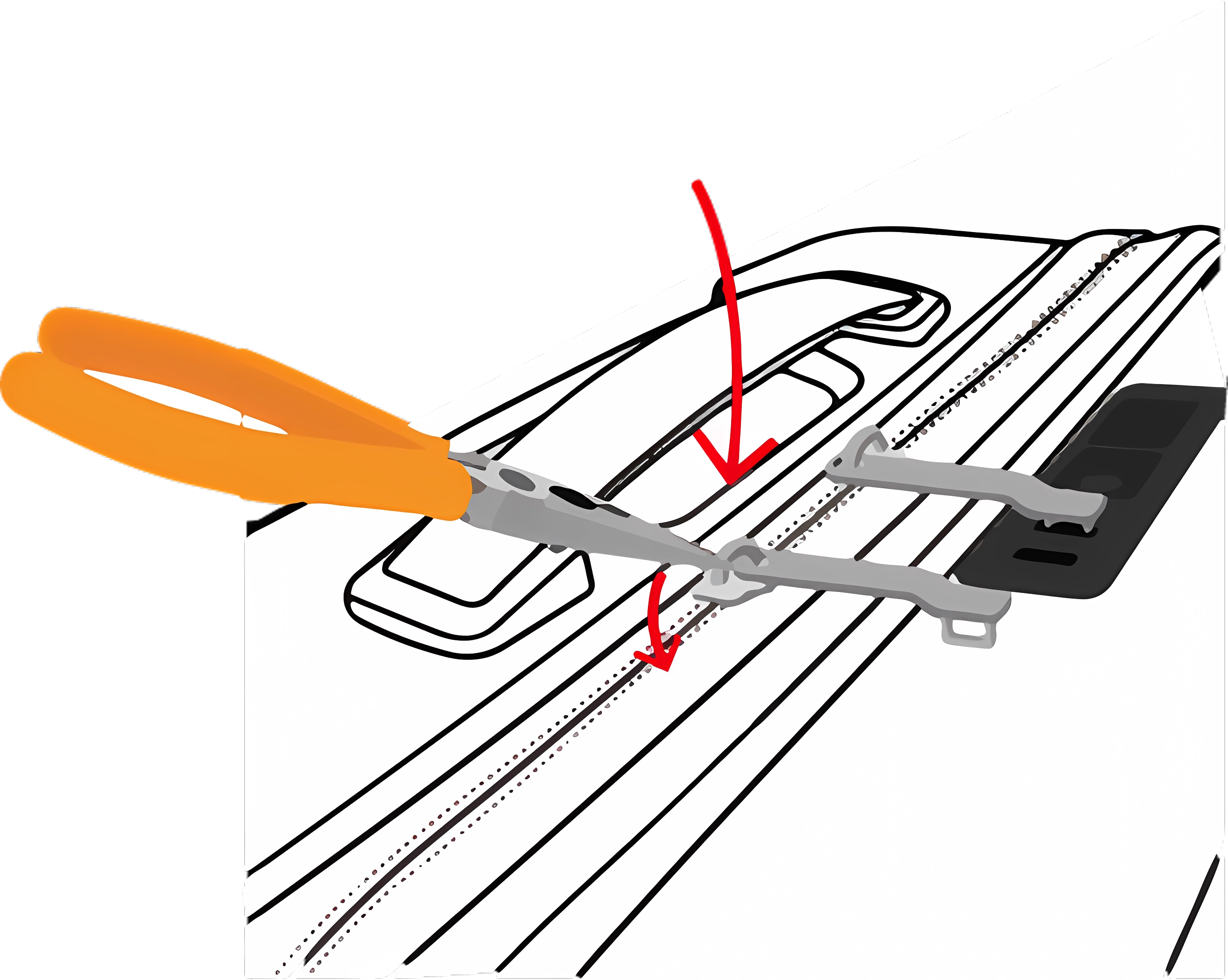 Après l'insertion du nouveau Tirette à Fermeture Éclair, la tête de la fermeture éclair doit être refermée pour sécuriser le Tirette à Fermeture Éclair. Utilisez les pinces pour appuyer doucement sur le Tirette à Fermeture Éclair.